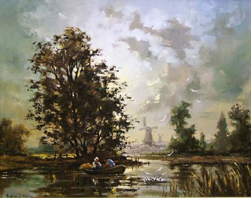 River Scene with Figures in a Rowing Boat, Windmills in the Distance