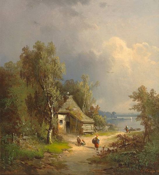 Seenlandschaft mit Figurenstaffage und reetgedeckter Hütte