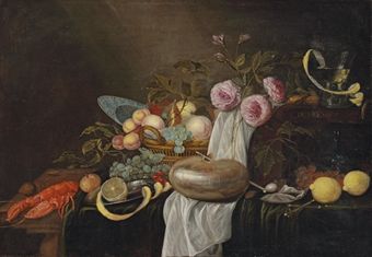 | Still life with a lobster, a peeled lemon, a basket of fruit, a nautilus shell with a pipe, an oyster, roses, a roemer, a locked | |