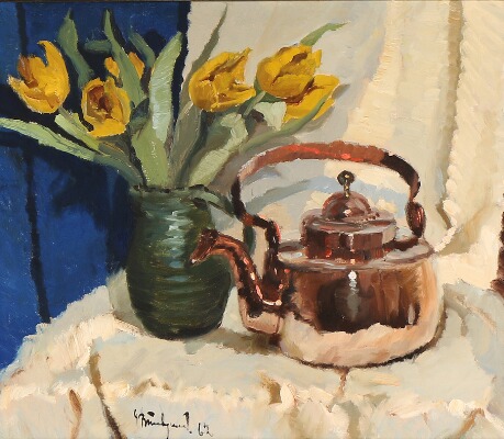 Still life with yellow tulips and a copper kettle