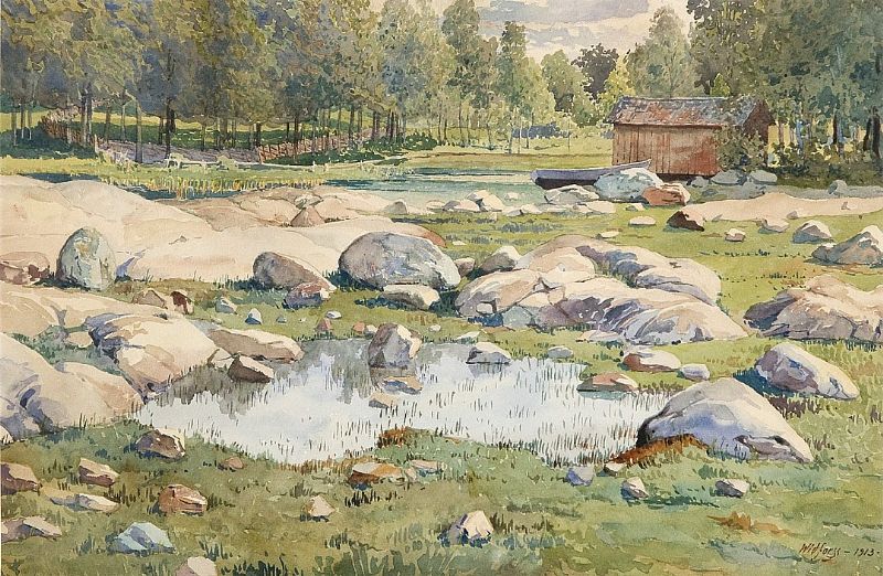 Sommarlandskap med vattendrag, båthus och båt
