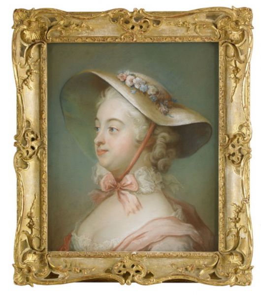 | Porträtt av Juliana Dorotea Henck bärandes schäferhatt av halmfläta med blommor kring kullen och skärt hakband - bröstbild | |