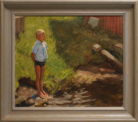 Knabe in kurzen Hosen, mit den bloßen Füßen in einem Bach stehend