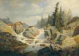 Landskap med fors. I förgrunden fiskare och flicka