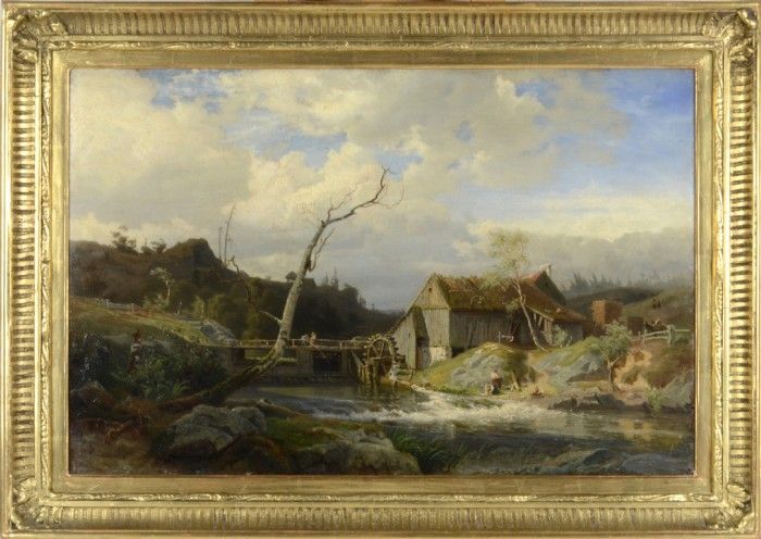 Landskap med vattenkvarn, tvätterskor och metande barn