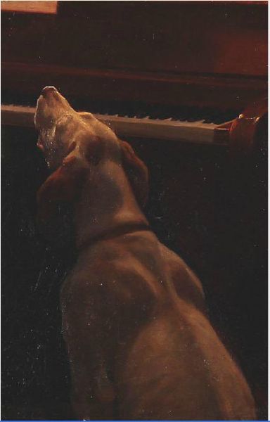 A dog sitting ear a piano