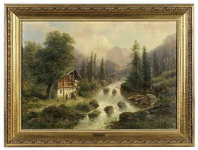 Landschaft mit Wildbach und Bauernhaus im Salzkammergut, figural staffiert