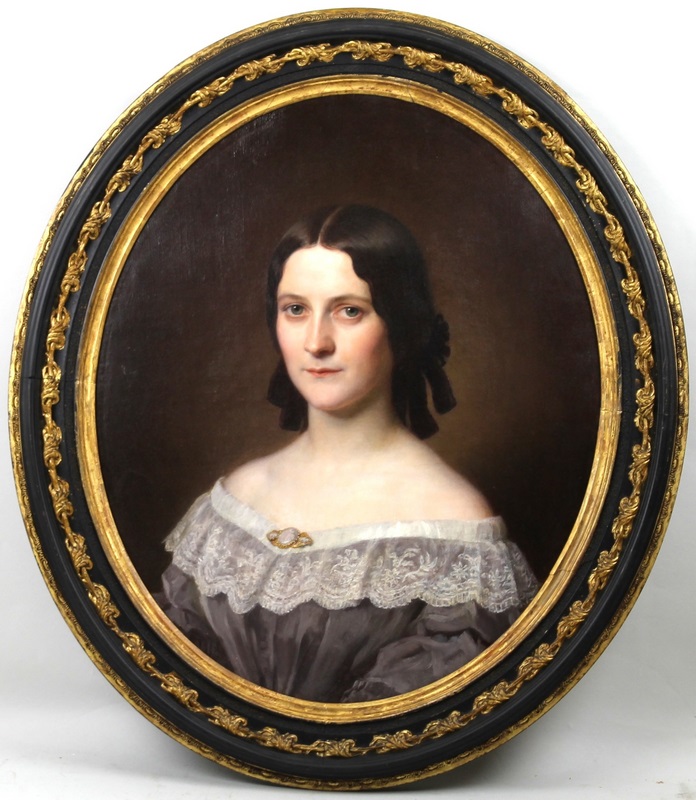| An oval portrait of a lady, in a grey dress with lace collar and cameo | |