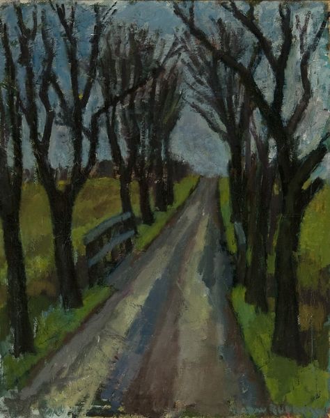 Väg med bro och nakna trädstammar.