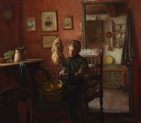 Country interior with a woman at a spinning wheel