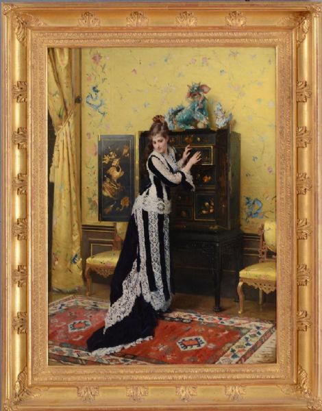 ELEGANT LADY STANDING BY A CHINESE CABINET