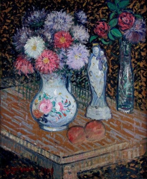 | NATURE MORTE AU VASE DE DAHLIAS ET À LA STATUETTE DE SAINTE ANNE | |