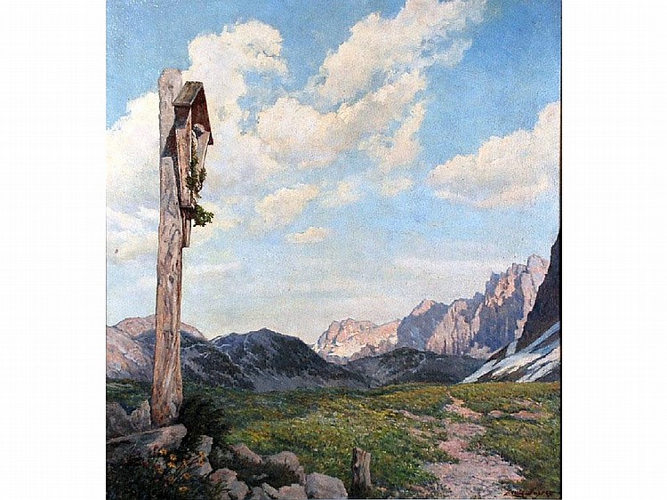 An Alpine landscape with a wayside shrine