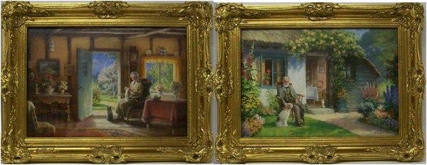 | A cottage interior with an elderly female and a cottage exterior with an elderly male | |