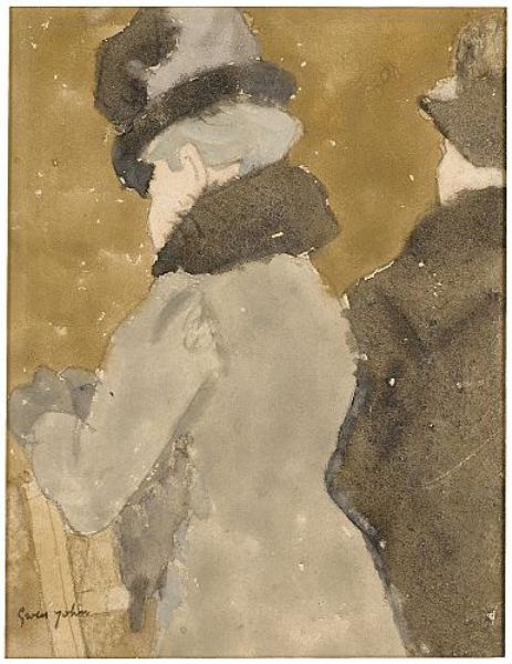 THREE QUARTER BACK VIEW OF AN OLD LADY IN GREY
