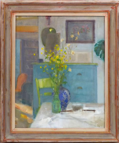 INTERIOR WITH A BLUE CHEST, YELLOW FLOWERS AND A WESTERWALD VASE