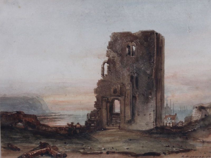 'A ruined castle on the cliffs above the sea; in the foreground a pile of cannon'