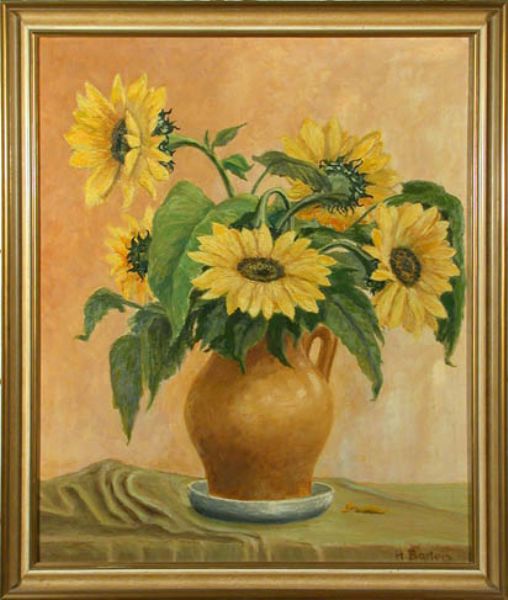 Sonnenblumenstrauß in braunem Tonkrug auf gefälteltem Tuch