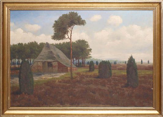 Wide, northern German heath landscape with lonely farm under summer cloudy sky