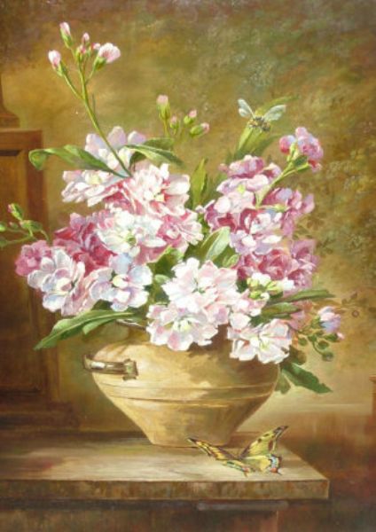 | Mauve flowers in a vase on a ledge with a butterfly and yellow flowers in vase on a ledge with a grasshopper | |