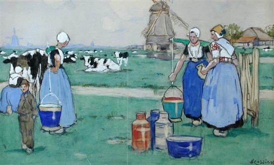 Dutch Village Scene; and Milkmaids with Cows by a Windmill