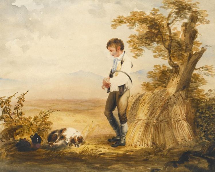 A REAPER AND HIS SPANIEL AT THE EDGE OF A FIELD
