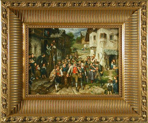 Gruppe aufständischer Bauern in einem alpenländischen Dorf.