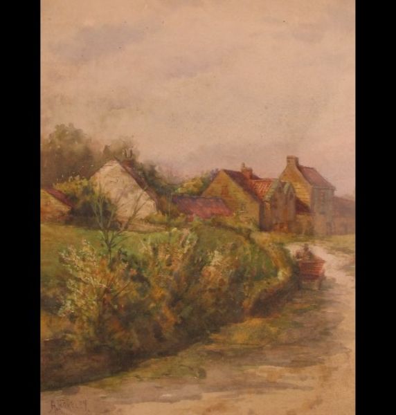 farm track with cart, buildings in the distance