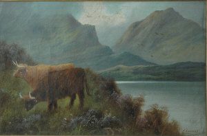 Highland cattle beside a loch