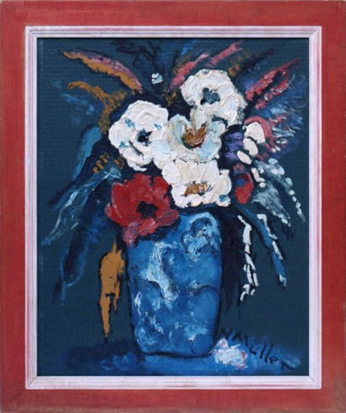 Blumenstrauß in blauer Vase vor dunklem Hintergrund