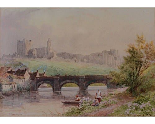 Figures by a bridge; cattle by castle ruins