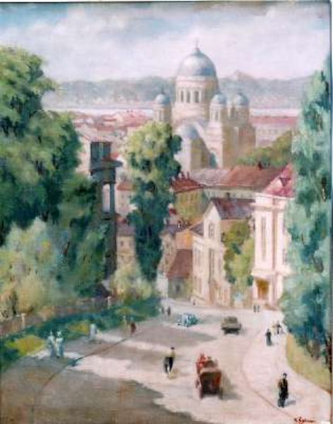 Südliche Stadt mit belebter Straße mit Fußgängern und Autos