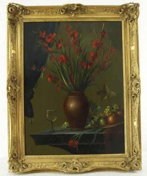 Blumenstilleben mit Gladiolen, Obst auf Teller mit Weinglas