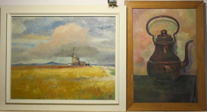 Landschap in Frankrijk met zicht op dorp en molen, koperen ketel