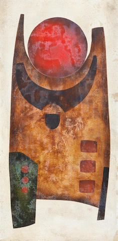 Three works:Abstract with red circle; Cubist abstract in brown; Abstract with interlocking forms