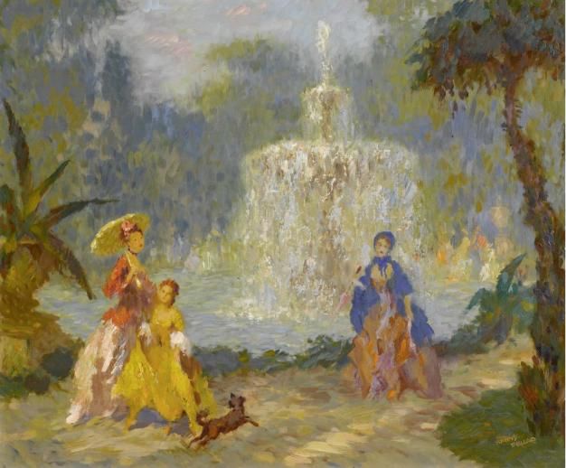 Elegant company in a park with fountain.