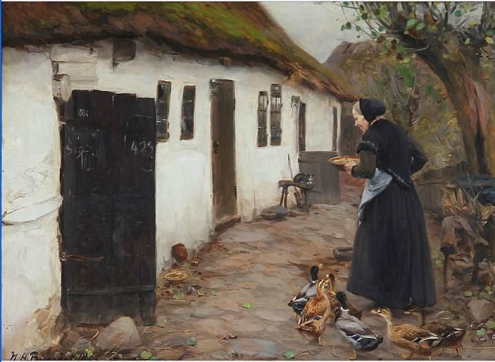 | A peasant woman feeding ducks at a whitewashed farmhouse. | |