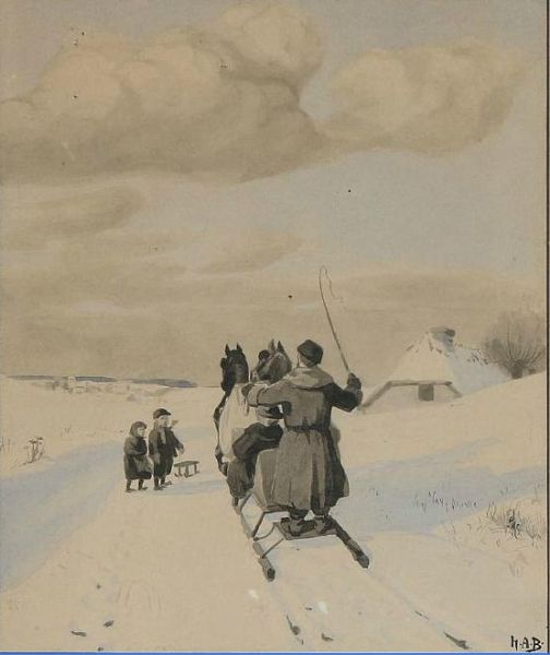 | Winter in the country with two kids seeing the sled goes by | |