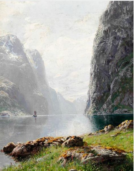| View of a Norwegian fiord with a sailing ship between tall vertical cliffs | |