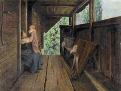 BÄUERLICHE LAUBE MIT MUTTER UND KIND.