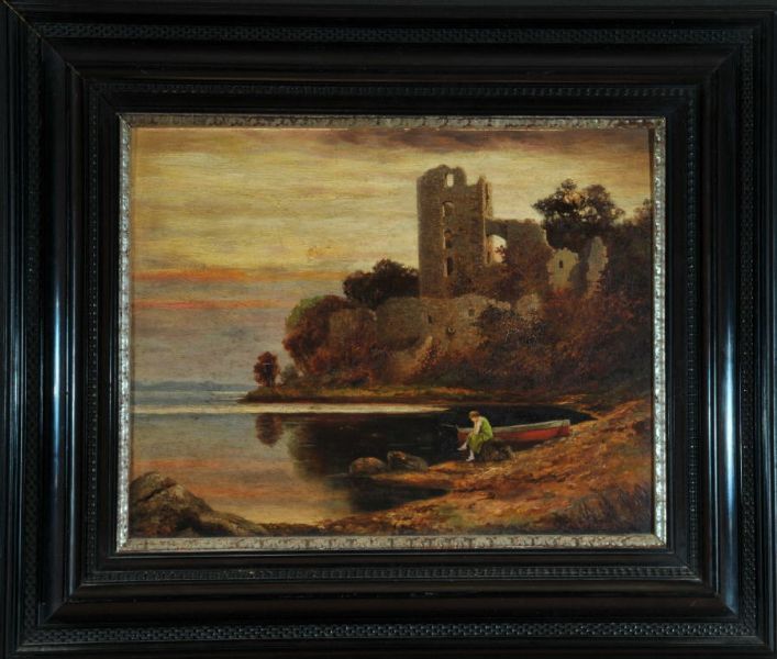 | Auf Felsbrocken sitzende Frau am Seeufer mit Ruderboot, im Hintergrund Burgruine | |