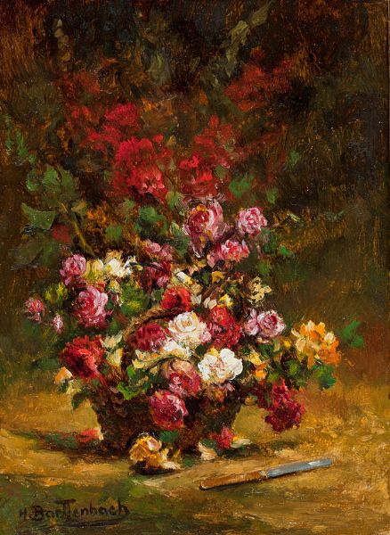 Mit Strauß aus bunten Rosen gefüllter Korb. Auf Boden, davor Messer.