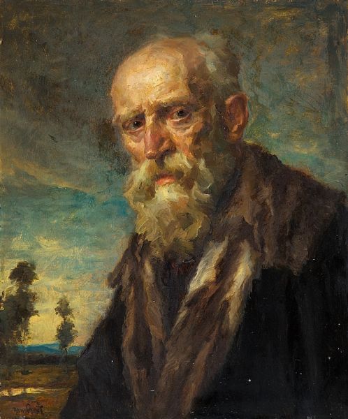 Der Starost. Graubärtiger alter Mann in pelzverbrämtem Mantel, vor Landschaft