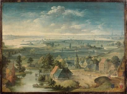 | Vue panoramique d'un village des Flandres à droite la ville d'Anvers | |