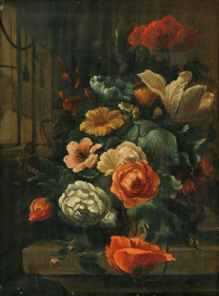 Stilleven met rozen, tulpen, klaprozen en een slak op een stenen plint