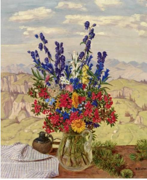 Bunter Blumenstrauß vor Gebirgslandschaft.