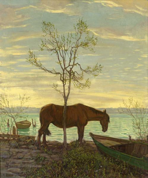 'Müdes Pferd' vor abendlicher Bodenseelandschaft