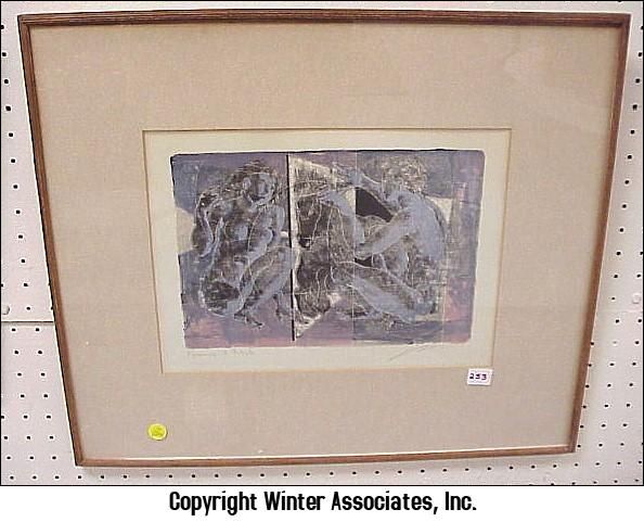 | depicts nude male and female figures between an image of a horse, blues and pinks are predominate colors | |