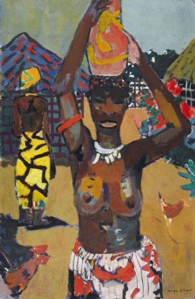 Afrikanerin mit Krug auf dem Kopf.