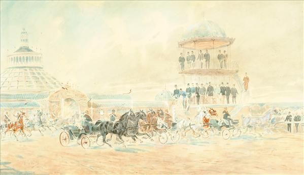 Carriage racing with Kaiser Franz Josef looking on from the stands